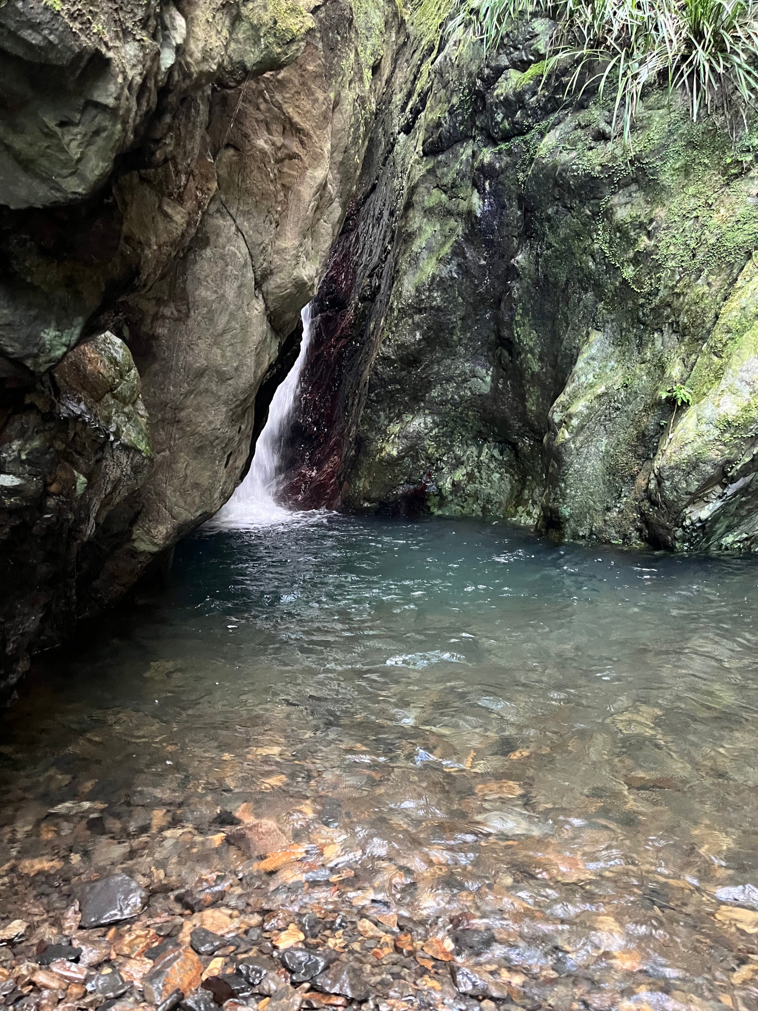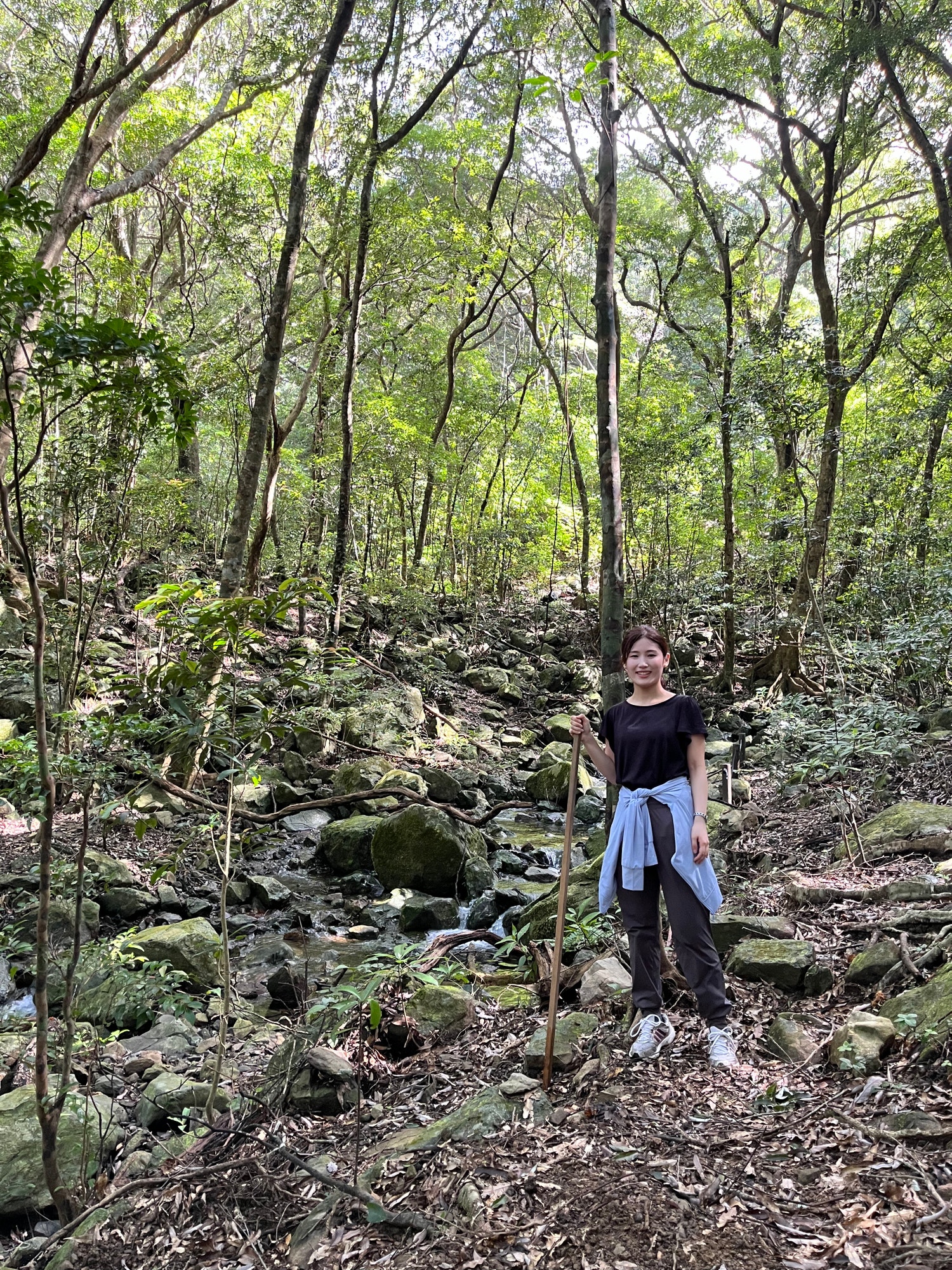 ガイドの方に動植物や虫などを案内してもらいながら進む途中、切株や岩の上にクロウサギのフンを発見しました。外敵から身を守るために見晴らしの良い所で用を足すのだそうです。登山道では3ヶ所の滝を見ることもでき、マイナスイオンに癒されました。また、冬には桜ツツジという白い花も咲くので、この時期の登山もオススメだそうです。