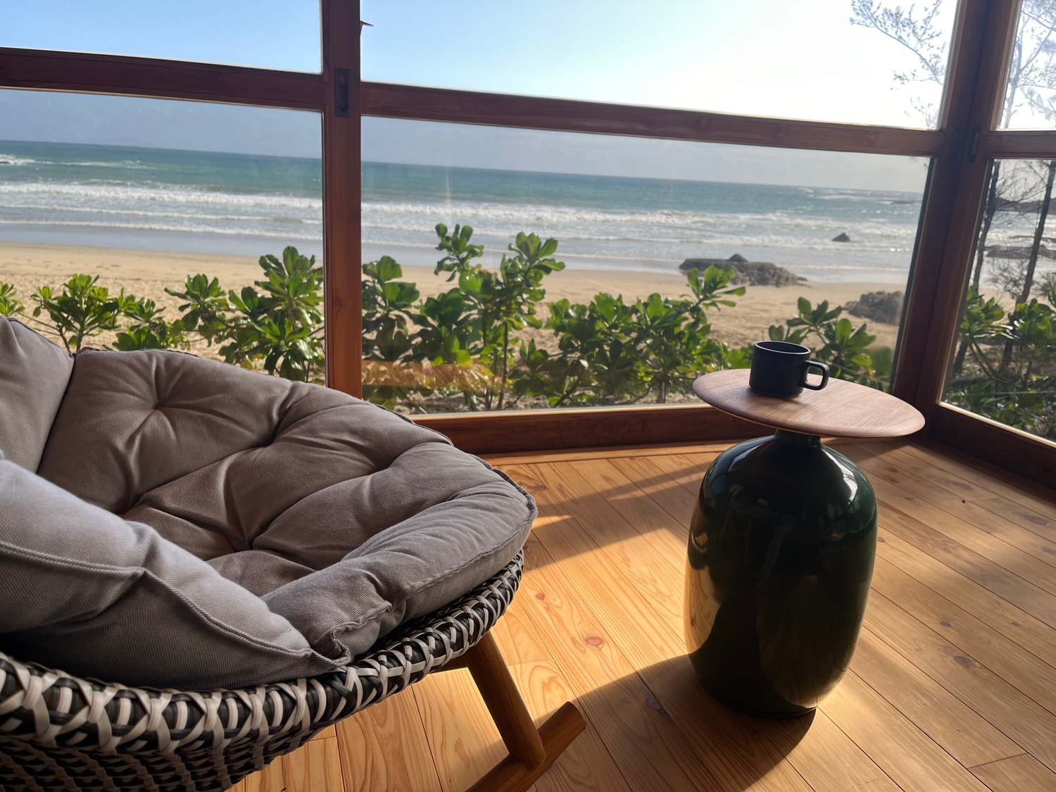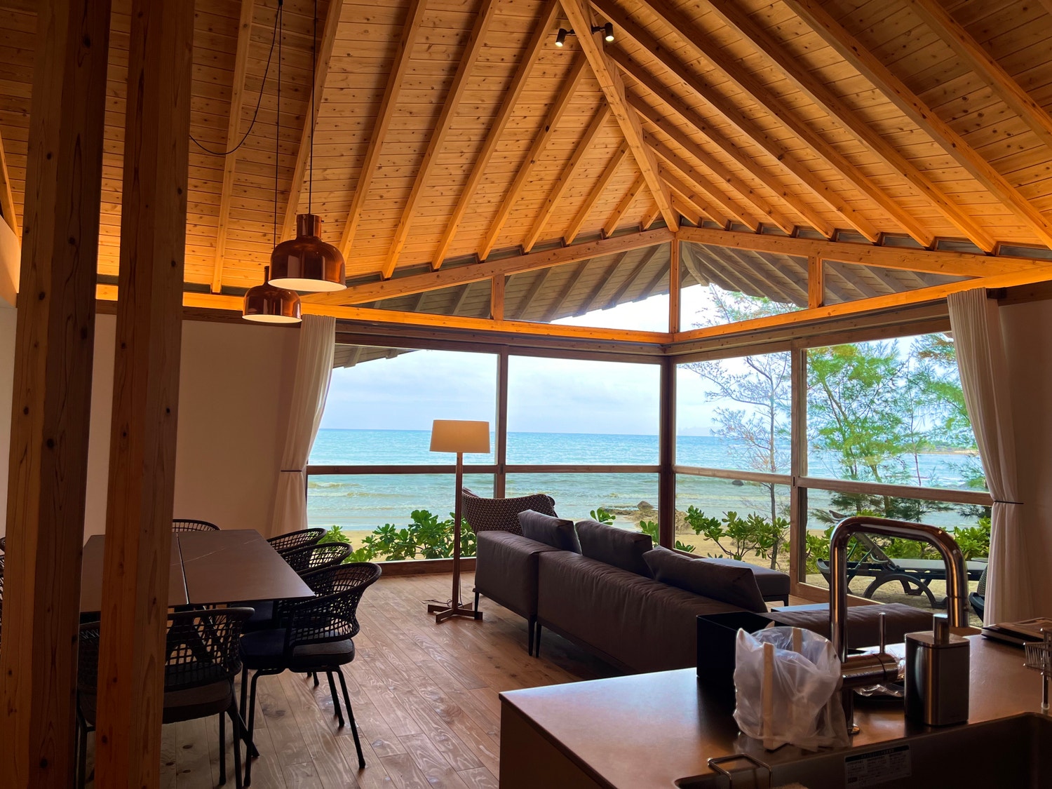 お部屋は木のいい香りに包まれていて、海が目の前に見える解放的なリビングが広がっていました。海水浴やサーフィンにもすぐ行けますし、部屋の中にいても波の音が心地よく聞こえてきます。