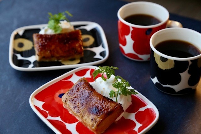 11月1日(土)から期間限定で発売される秋冬限定スイーツ「MIYAKODAカタラーナ」がおすすめです。スペイン・カタルーニャ地方発祥のデザートで、冷たく濃厚なプリンのような味わいが特徴。表面には国産純黒糖をまぶし、バーナーで炙ったキャラメリゼのサクサク食感も魅力です。食器も全てマリメッコで統一されていてかわいいですよね。