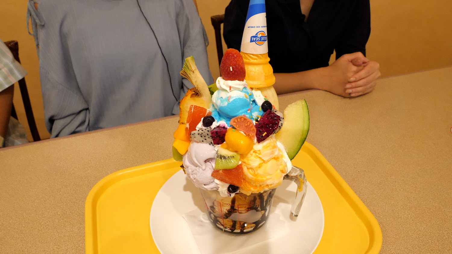 季節のフルーツや沖縄ならではのBLUE SEALアイスが6種類も使われたこのパフェは、旅を一気に盛り上げてくれること間違いなしです。