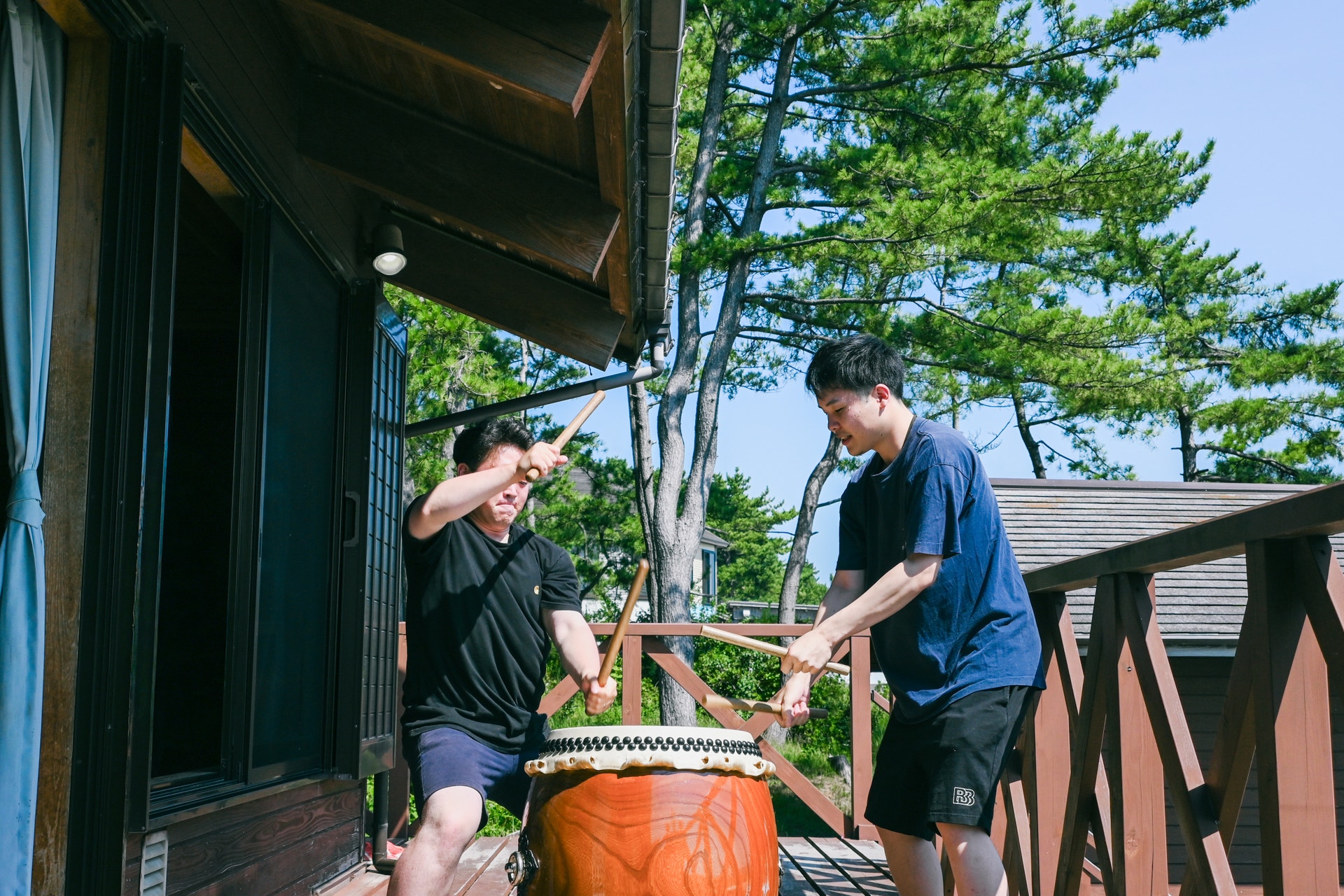 2人がペアになって、ひとつの太鼓を打つのが特徴で、