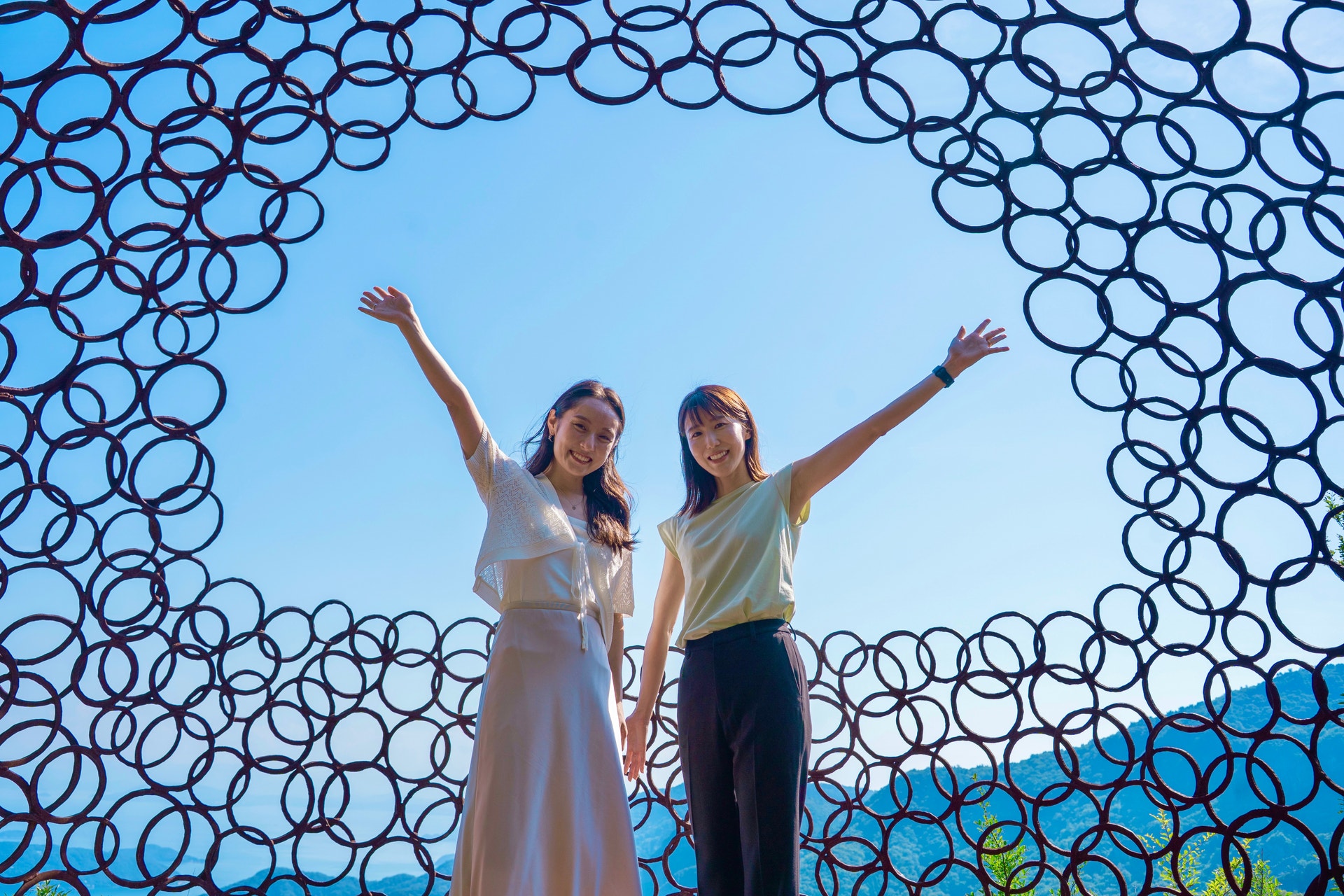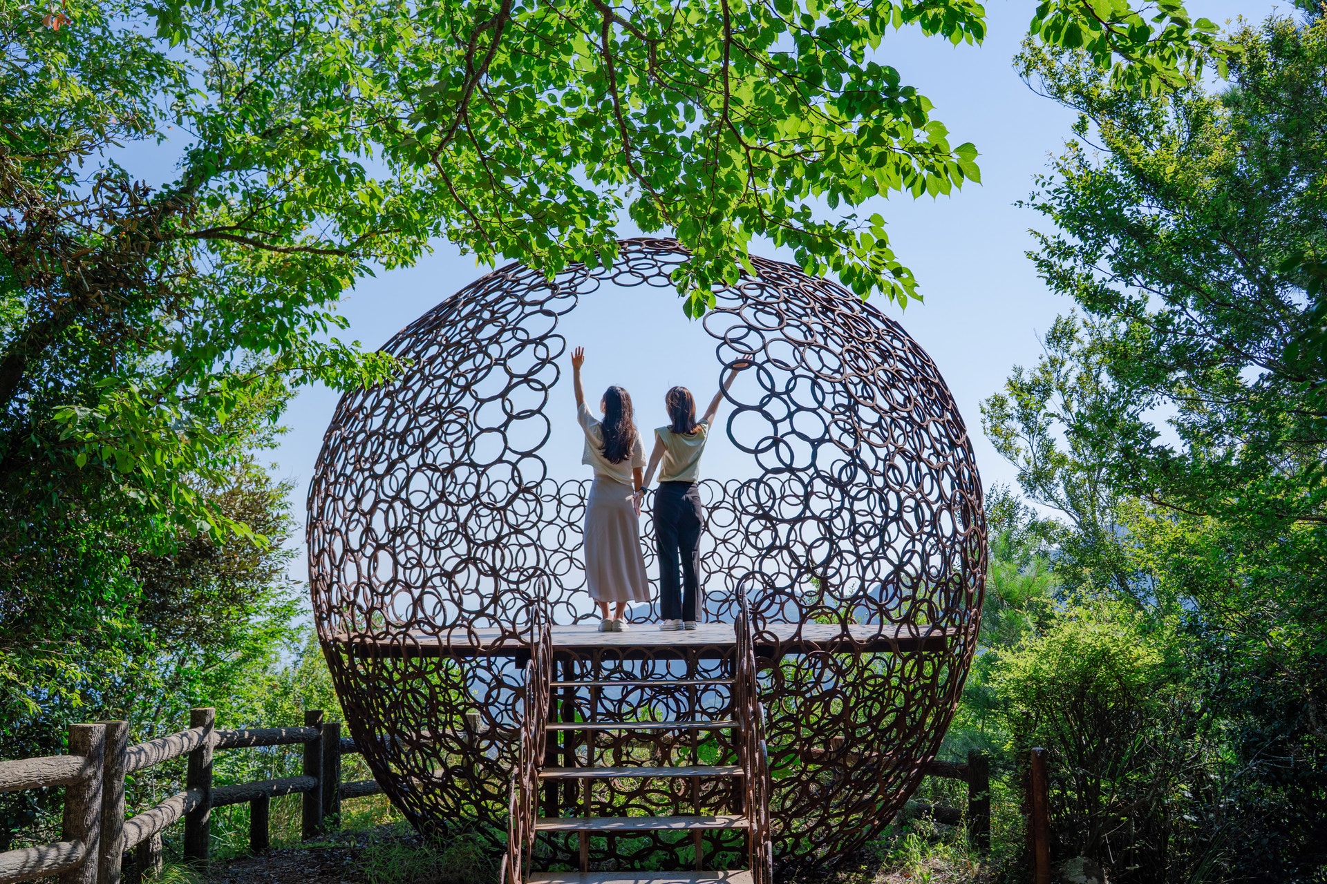 寒霞渓山頂から徒歩10分ほどの場所にある作品「空の玉」は、直径約4メートルの鉄の球体で、中に入ると卵の殻に守られているような安心感があります。
